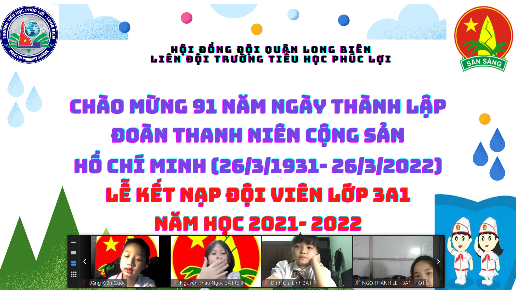 Nhân dịp kỷ niệm 91 năm Ngày thành lập Đoàn TNCS Hồ Chí Minh (26/3/1931-26/3/2022), sáng ngày 21/03/2022, được sự nhất trí của Ban Giám hiệu nhà trường, Liên đội trường Tiểu học Phúc Lợi tổ chức lễ kết nạp đội viên mới cho 73 em học sinh của khối lớp 3. Buổi lễ được diễn ra theo hình thức trực tuyến nhưng vẫn mang lại không khí trang trọng, đánh dấu sự trưởng thành về mọi mặt của các nhi đồng.