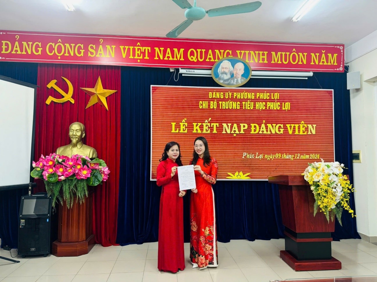 Thực hiện quyết định số 2134 QĐ/QU ngày 21/11/2024 của Ban thường vụ quận ủy Long Biên về chuẩn y kết nạp đảng viên, ngày 09 tháng 12 năm 2024, Chi bộ trường Tiểu học Phúc Lợi đã long trọng tổ chức Lễ kết nạp đảng viên cho quần chúng Ngô Hà My.