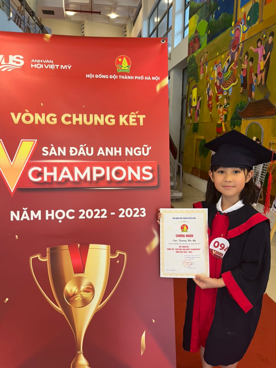 !important; Căn cứ Thể lệ cuộc thi “Sàn đấu Anh ngữ V-Champions” (ban hành theo Công văn số 04-CV/HĐĐTP ngày 07/11/2022 của Hội đồng Đội Thành phố) và kết quả của Vòng loại cuộc thi, em Trương Hà My lớp 2A2 đã tham gia thi đấu vòng Chung kết khối 1-2. Cuộc thi được tổ chức theo hình thức Rung chuông vàng vô cùng gay gấn. Hà My đã xuất sắc cùng 10 thí sinh trả lời hết 20 câu hỏi và giành đồng giải Nhất của cuộc thi.