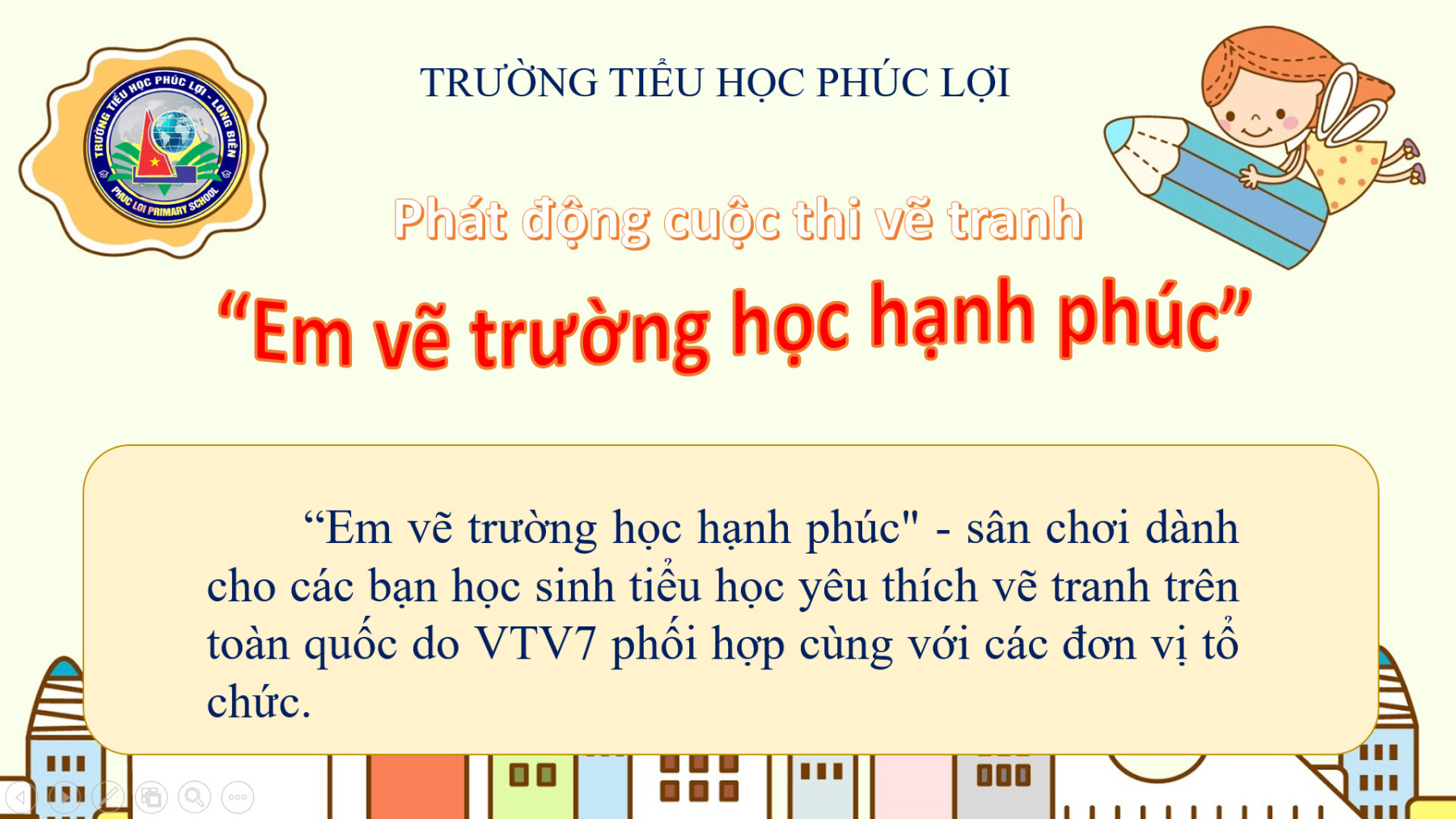 ”. Thực hiện công văn số 702/SGDĐT-GDTH ngày 16/03/2023 của Sở Giáo dục và Đào tạo Hà Nội về phối hơp phát động cuộc thi “Em vẽ trường học hạnh phúc”. Trường Tiểu học Phúc Lợi phát động cuộc thi đến học sinh toàn trường.