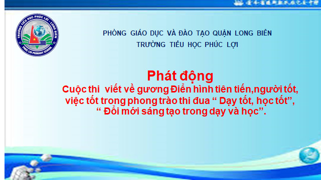 Thực hiện Kế hoạch số 4065/KH-SGD&ĐT ngày 25/11/2021 của Sở Giáo dục và Đào tạo về Tổ chức cuộc thi viết về gương điển hình tiên tiến, người tốt, việc tốt trong phong trào thi đua “ Dạy tốt, học tốt”, “ Đổi mới sáng tạo trong dạy và học” ngành GD&ĐT Hà Nội; Căn cứ Kế hoạch số 63/KH-HĐTĐKT ngày 12/11/2021 của Hội đồng Thi đua khen thưởng quận Long Biên về Tổ chức cuộc thi phát hiện và viết về gương điển hình tiên tiến, người tốt, việc tốt và công tác phát hiện, tuyên truyền, nhân rộng điển hình tiên tiến trong phong trào thi đua yêu nước quận Long Biên năm 2022; trường Tiểu học Phúc Lợi phát động cuộc thi Cuộc thi viết về gương Điển hình tiên tiến,người tốt, việc tốt trong phong trào thi đua “ Dạy tốt, học tốt”, “ Đổi mới sáng tạo trong dạy và học” ngành Giáo dục và Đào tạo quận Long Biên.