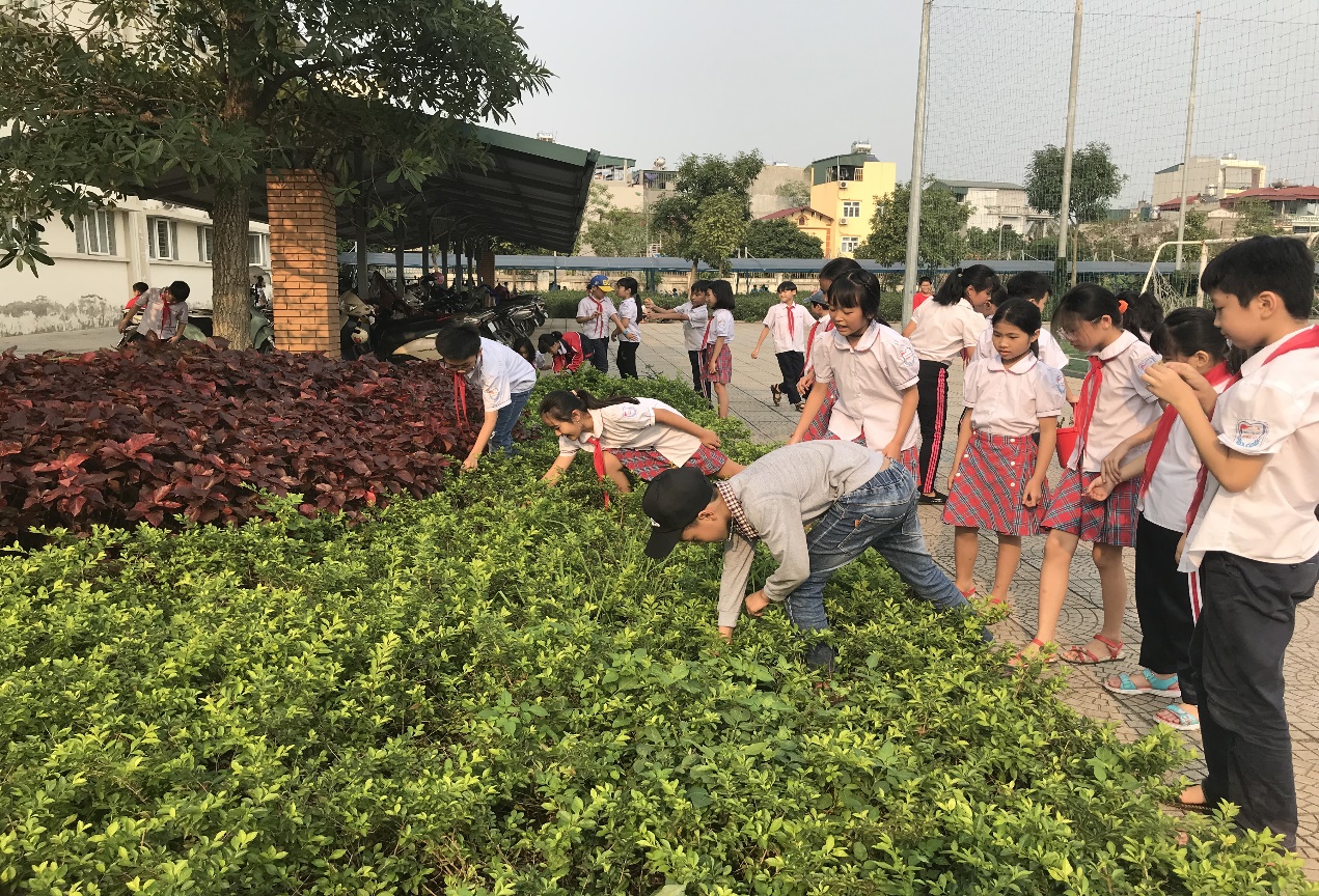 Các em học sinh tích cực nhổ cỏ, nhặt rác
