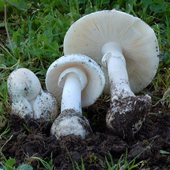 Nấm độc trắng: mũ màu trắng, đường kính từ 7- 10cm, có bao gió dáng đài hoa, có vòng nấm màu trắng ở trên cuống.