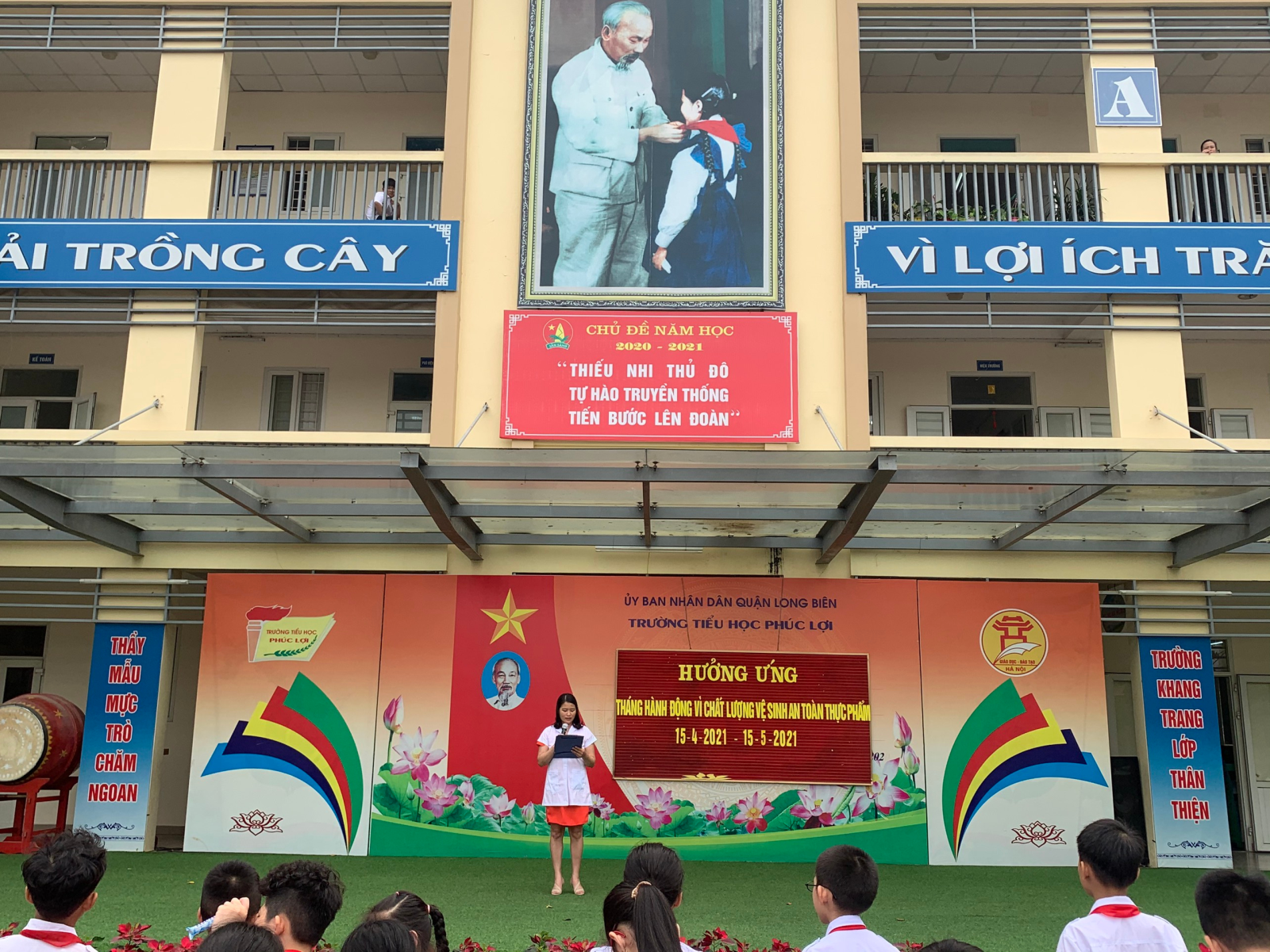 Sáng ngày 16/4/2021, giáo viên, học sinh trường Tiểu học Phúc Lợi đã hưởng ứng tháng hành động vì chất lượng vệ sinh an toàn thực phẩm (15/4/2021-15/5/2021). Với sự tham gia của 55 cán bộ giáo viên, 1515 học sinh nhà trường. Đồng chí Nguyễn Thanh Hoa- nhân viên y tế đã tuyên truyền về mối nguy hiểm khi ăn quà vặt tại cổng trường.